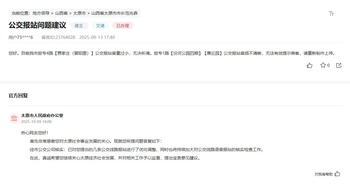 网友留言反映:“太原市旅专4路【贾家庄(晋阳里)】公交报站音量过小,无法听清。旅专1路【汾河公园四期】【雁丘园】公交报站音频不清晰,无法有效提示乘客,请重新制作上传。”【留言地址】