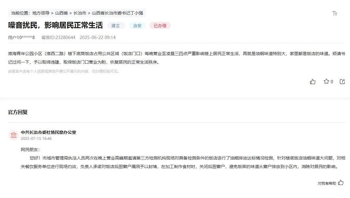 人民网太原10月14日电 (记者段思齐)城市化进程中,城市烟火气日益浓厚,但噪音扰民、公共交通出行不便等琐碎问题也随之出现,给市民带来困扰。近期,山西网友通过人民网 “领导留言板” 反馈各类民生问题,各地迅速响应并积极解决,致力于提升市民幸福感。