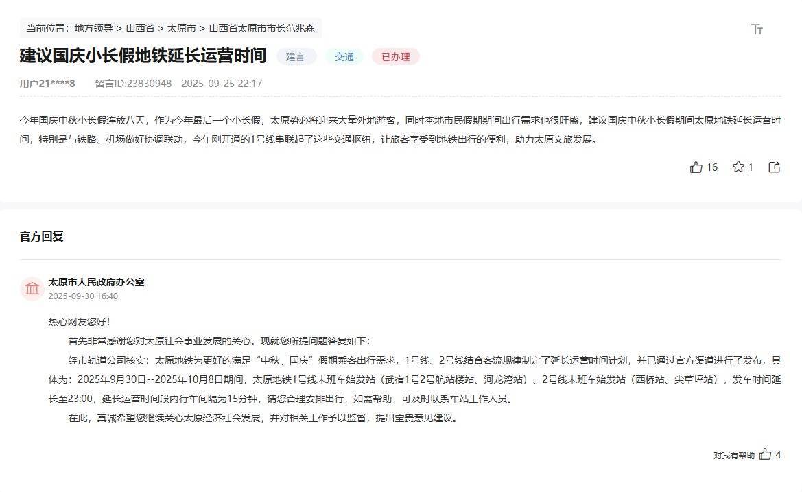 太原市政府办公室立即办理,并在假期前给出回复称:太原地铁为更好满足假期乘客出行需求,1号线、2号线结合客流规律制定了延长运营时间计划,并已通过官方渠道进行了发布。记者了解到,9月30日—10月8日期间,太原地铁1号线末班车始发站、2号线末班车始发站发车时间延长到23:00,延长运营时间段内行车间隔为15分钟。